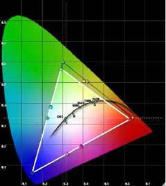 After a warm-up period, a series of primary color and white test pattern windows was displayed on each plasma TV and measured with a color analyzer to determine the values for each color displayed. The analyzer software then compared the resulting color gamut for each plasma TV with the standard REC-709 HDTV color gamut and SMPTE-C color gamuts. Note that each plasma TV’s “standard” or “normal” setting was used for these tests. Where color temperature was selectable, the “middle” settings were chosen. No adjustments were made to RGB drive/contrast or gain/brightness; only factory picture settings were used.